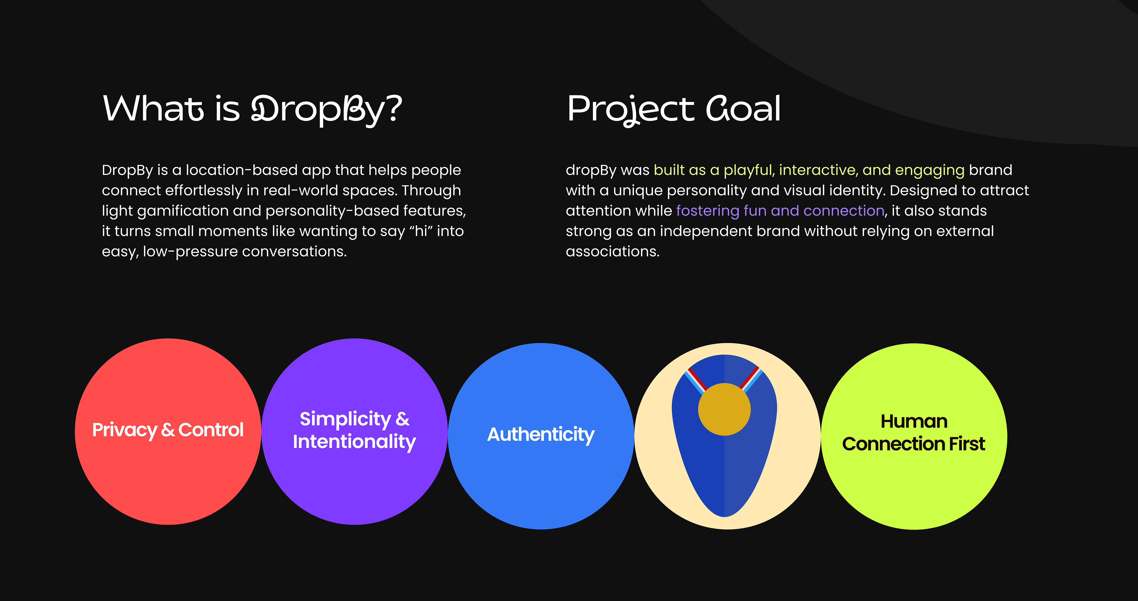 DropBy is a location-based app that helps people connect effortlessly in real-world spaces. Through light gamification and personality-based features, it turns small moments like wanting to say “hi” into easy, low-pressure conversations.